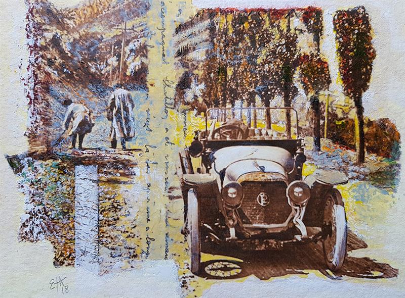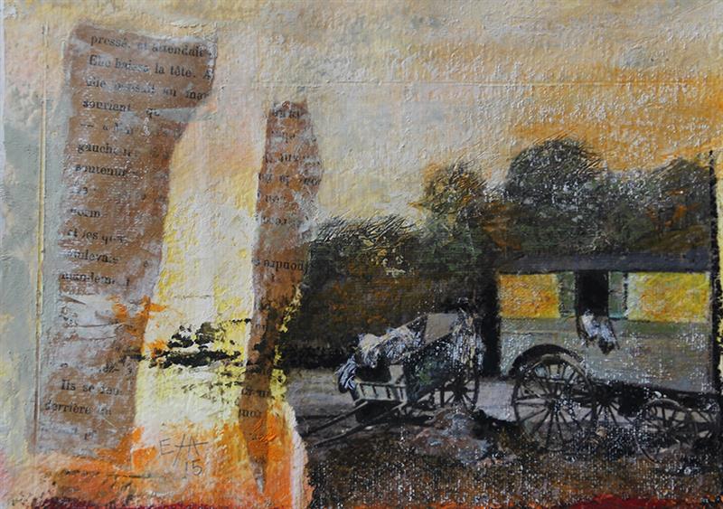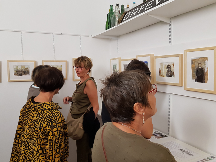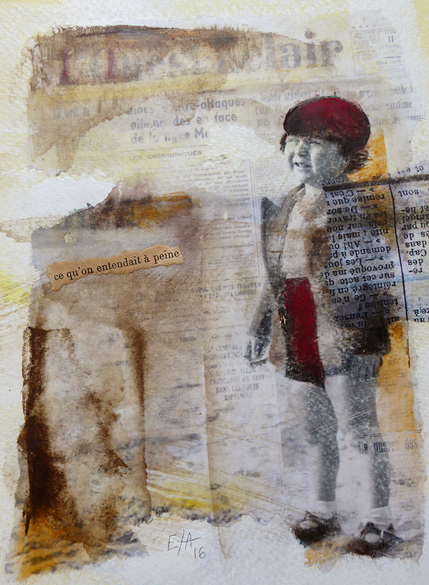 Ainsi, je prends le temps de m’approprier ces plaques et négatifs. Je scanne, traite en infographie, imprime. Je prends le temps de la composition, temps de l’apparition-disparition de l’image. Je travaille, transforme mes papiers, les maroufle. Je peins, trace, inscris un autre temps...