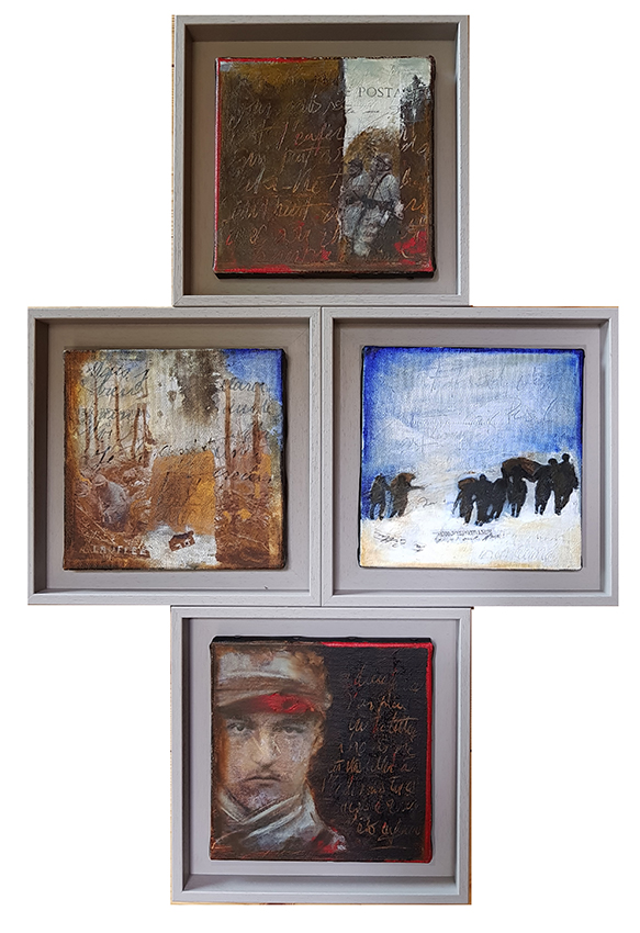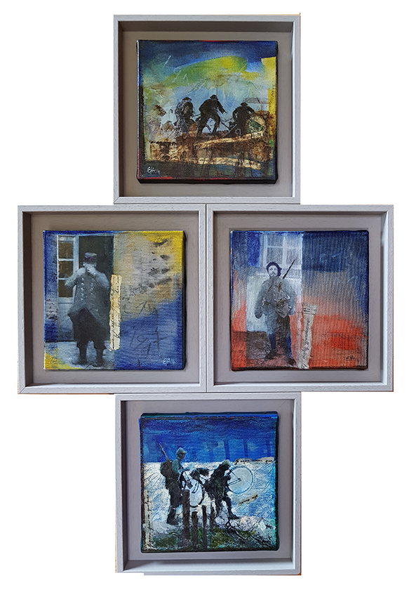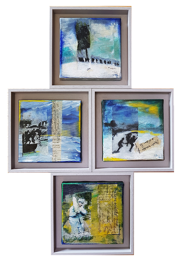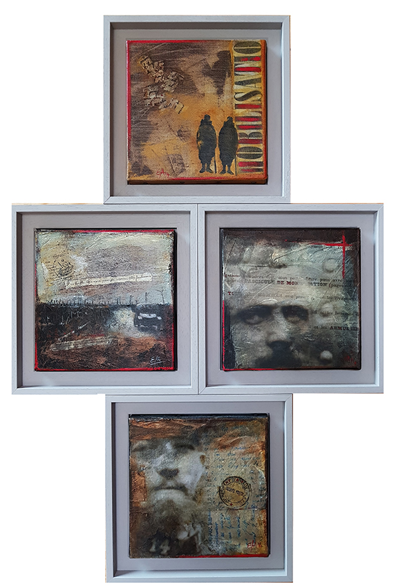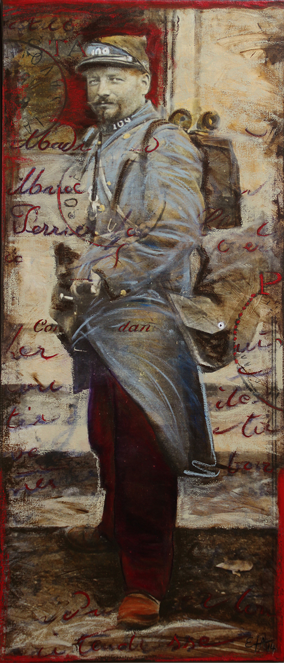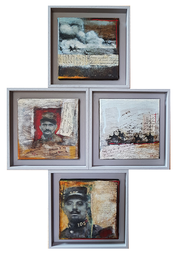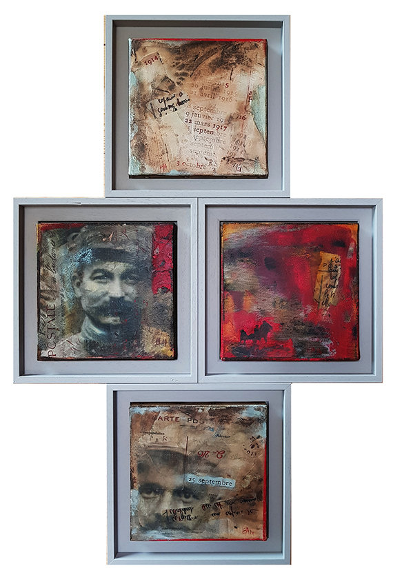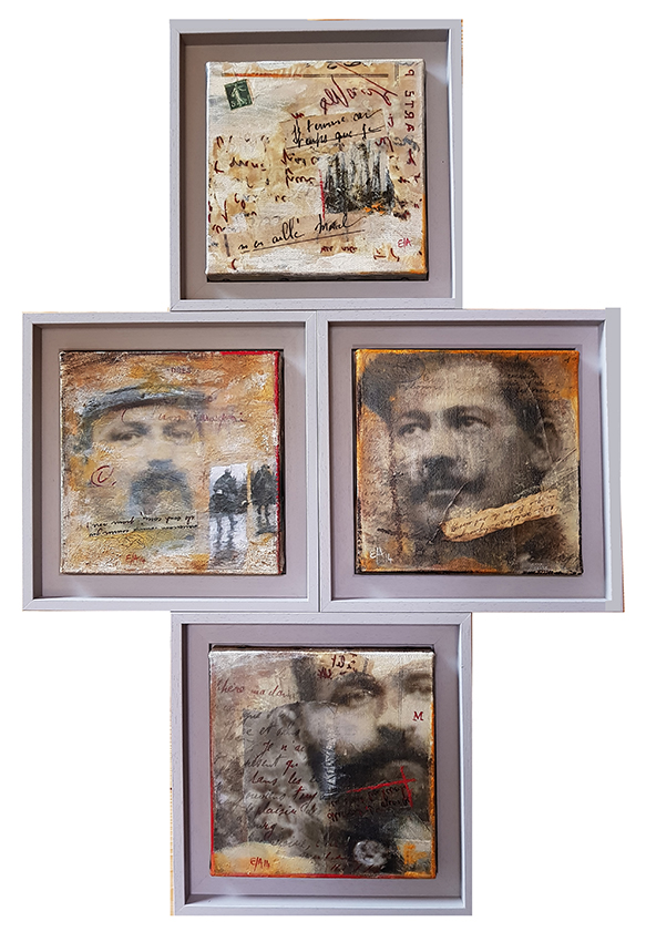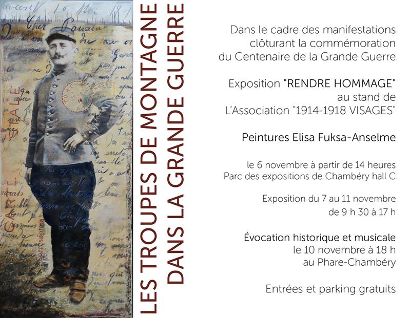 Dans le cadre de la grande manifestation au Parc des expositions à Chambéry, venant clôturer les quatre ans de commémoration de la Grande Guerre, l'association "Visages 14-18" m'a invitée à les rejoindre. Mon travail Échos de la Grande Guerre, Correspondances exposition proposée par l’Espace culturel de Saint-Jean-de-Maurienne et la Galerie Ruffieux-Bril à Chambéry en 2014 a été revisité pour cette manifestation.