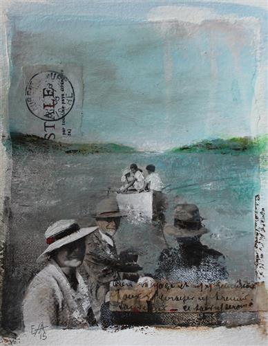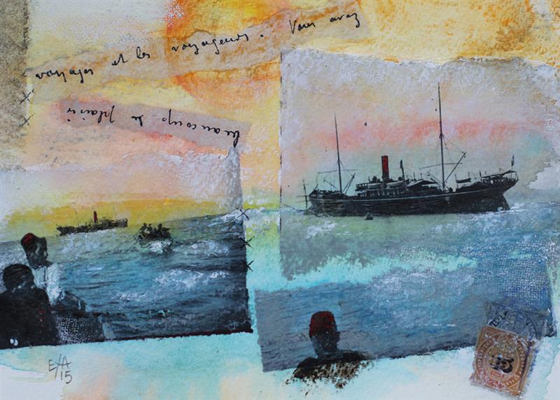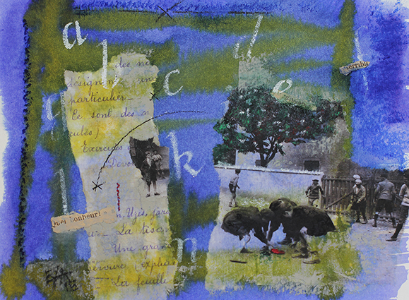 techniques mixtes (collage d'impressions numériques, encre, crayon, huile) sur papier aquarelle.
